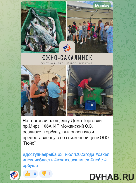 При этом у соседей информацию о поставках и стоимости лосося до жителей доносят оперативно с помощью telegam-каналов: там указывают и адреса магазинов, и ассортимент, и количество рыбы, которую реализуют в рамках программы.